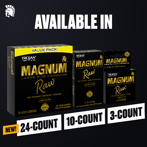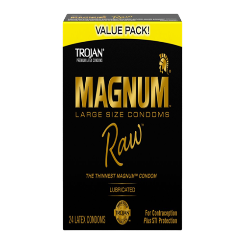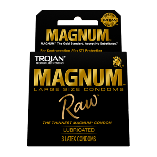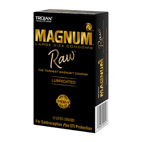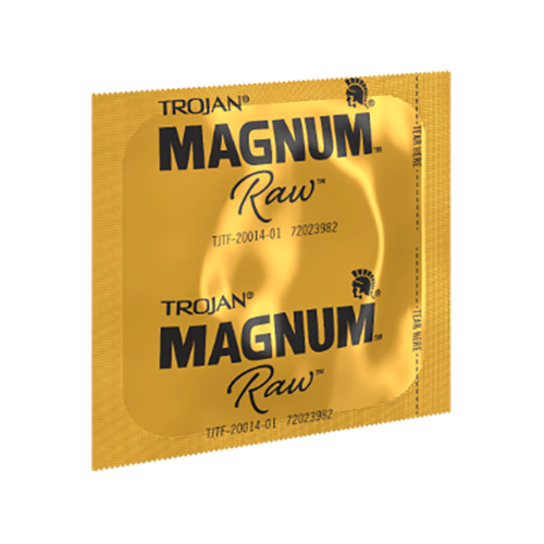 Experience sensation with the gold wrapper. Don't sacrifice protection. With a flared design and reservoir tip, Trojan™ Magnum ™ Raw™ condoms are the thinnest Magnum™ condom but still have a large size and wider base. The contoured shape gives a sleek fit and silky lubricant helps add even more pleasure to your shared experience.