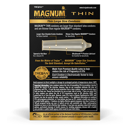 Sized up from regular condoms, yet sleeker than regular Magnum™ condoms. These large thin condoms help provide close intimacy, while the UltraSmooth™ Premium Lubricant, contoured fit, and reservoir tip give combined protection and pleasure for those who are bigger.