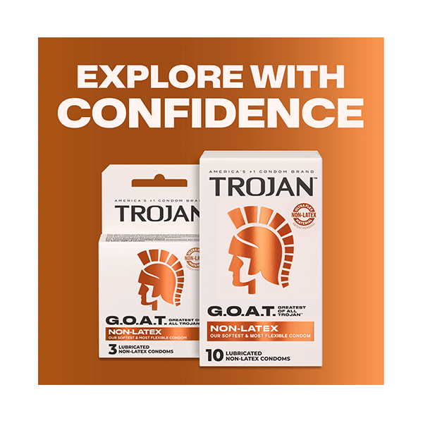 Introducing Trojan G.O.A.T., the Greatest of All Trojan, a breakthrough in non-latex protection. Engineered with patent-pending Ultra Flex Non-Latex material, it’s strong, flexible, and soft to deliver on connection that helps you feel close, warm, and in sync. Unlike some latex condoms, G.O.A.T. is odorless and colorless, helping you stay focused on what matters most. The innovation doesn’t stop there. Trojan G.O.A.T. condoms are designed for next-level intimacy by helping enhance body heat transfer for a deep, intimate connection. And with a silky smooth silicone lubricant that heightens sensitivity and effortless glide. While pleasure is a priority, safety isn’t up for compromise. Trojan condoms help reduce the risk of pregnancy and sexually transmitted infections (STIs), so you can explore the thrilling adventure of sex. Trojan Brand Condoms are America's #1 Condom brand, trusted for over 100 years.