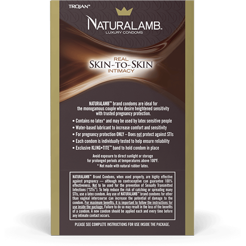 Incredibly skin-to-skin, it feels ultra intimate. Trojan™ Naturalamb™ are a non-latex option for those sensitive to latex. Made with water-based lubricant and intended for monogamous couples. They prevent pregnancy, but do not protect against Sexually Transmitted Infections. With a tapered, flared design, and KlingTite™ band they fit as close to you as possible.