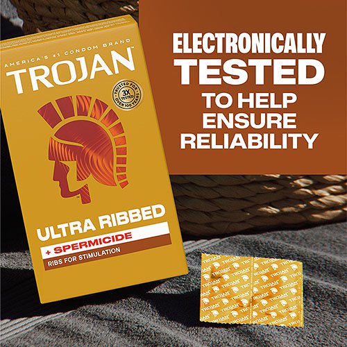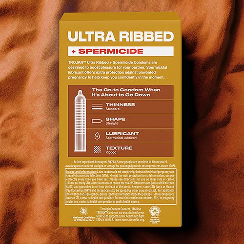 Feel the ridges and sensation. Trojan™ Ultra Ribbed Condoms with Spermicide take stimulation to new levels with their deep ribbing and added Nonoxynol-9 (7%) Spermicide for extra pregnancy protection. Lubricated and ready for action, they’re built to keep the thrills coming. Just a heads-up: spermicide doesn’t guard against HIV or STIs, and these aren’t made for anal sex.