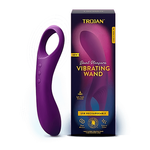 Multiply your mutual sensation. Use the rechargeable Trojan™ Dual Pleasure Vibrating Wand to explore simultaneous couple’s stimulation or partake in solo play. This 2-in-1 sex toy with wand for her and ring for him is made with soft touch, easy-to-clean silicone to reduce hassle and double enjoyment.